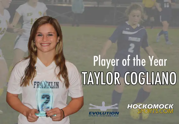 Franklin junior forward Taylor Cogliano has been named the second annual HockomockSports.com Girls Soccer Player of the Year. Cogliano was also voted the Hockomock League MVP by the coaches and was named an All-New England player by the Eastern Massachusetts Soccer Coaches Association. She finished the season with 10 goals and five assists for the Kelley-Rex champion Panthers.